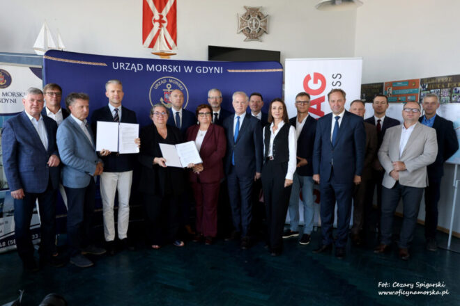 Umowę podpisali: Anna Stelmaszyk-Świerczyńska – dyrektor Urzędu Morskiego w Gdyni oraz inwestor budowy falochronu, Przemysław Kuliś – dyrektor Budownictwa Ogólnego firmy Strabag, w asyście gości.