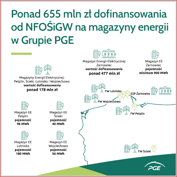 PGE otrzymała dofinansowanie z Narodowego Funduszu Ochrony Środowiska i Gospodarki Wodnej (NFOŚiGW) na realizację inwestycji w zakresie magazynowania energii elektrycznej. Wsparcie zostało przyznane na budowę Magazynu Energii Żarnowiec, a także na cztery mniejsze inwestycje: ME Pelplin, ME Ścieki, ME Lotnisko i ME Wojciechowo – poinformował Konrad Mróz – Kierownik Komunikacji Zewnętrznej i Biura Prasowego PGE Polska Grupa Energetyczna.