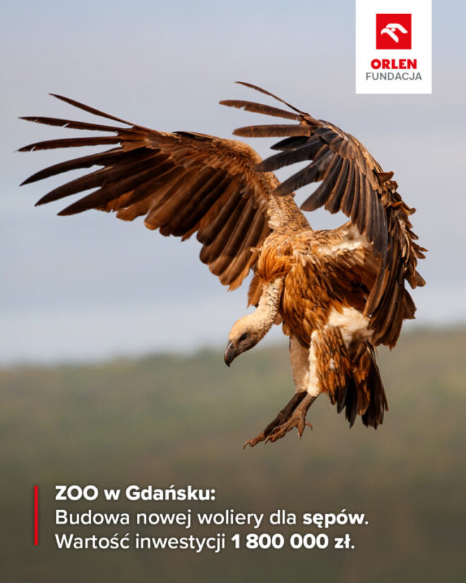 Sępy wracają – Fundacja ORLEN finansuje nową wolierę w Gdańskim ZOO, przekazując 1 800 000 zł. na rzecz ocalania naszych skrzydlatych przyjaciół, Łącznie przeznaczyła na ten cel niemal cztery miliony złotych dla ZOO w Warszawie, Gdańsku i Płocku
