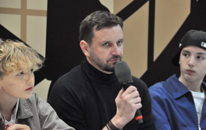 Reżyser Piotr Domalewski („Złote Lwy” za film „Ministranci”) wraz z młodymi aktorami grającymi ministrantów. Fot. Jerzy Uklejewski.